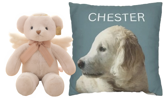Experience the comfort of holding your best friend again. Our patent pending, soft-sided urns fit perfectly inside custom pet portrait pillows and plush animals. Create a warm, huggable keepsake that brings comfort to your grieving heart.